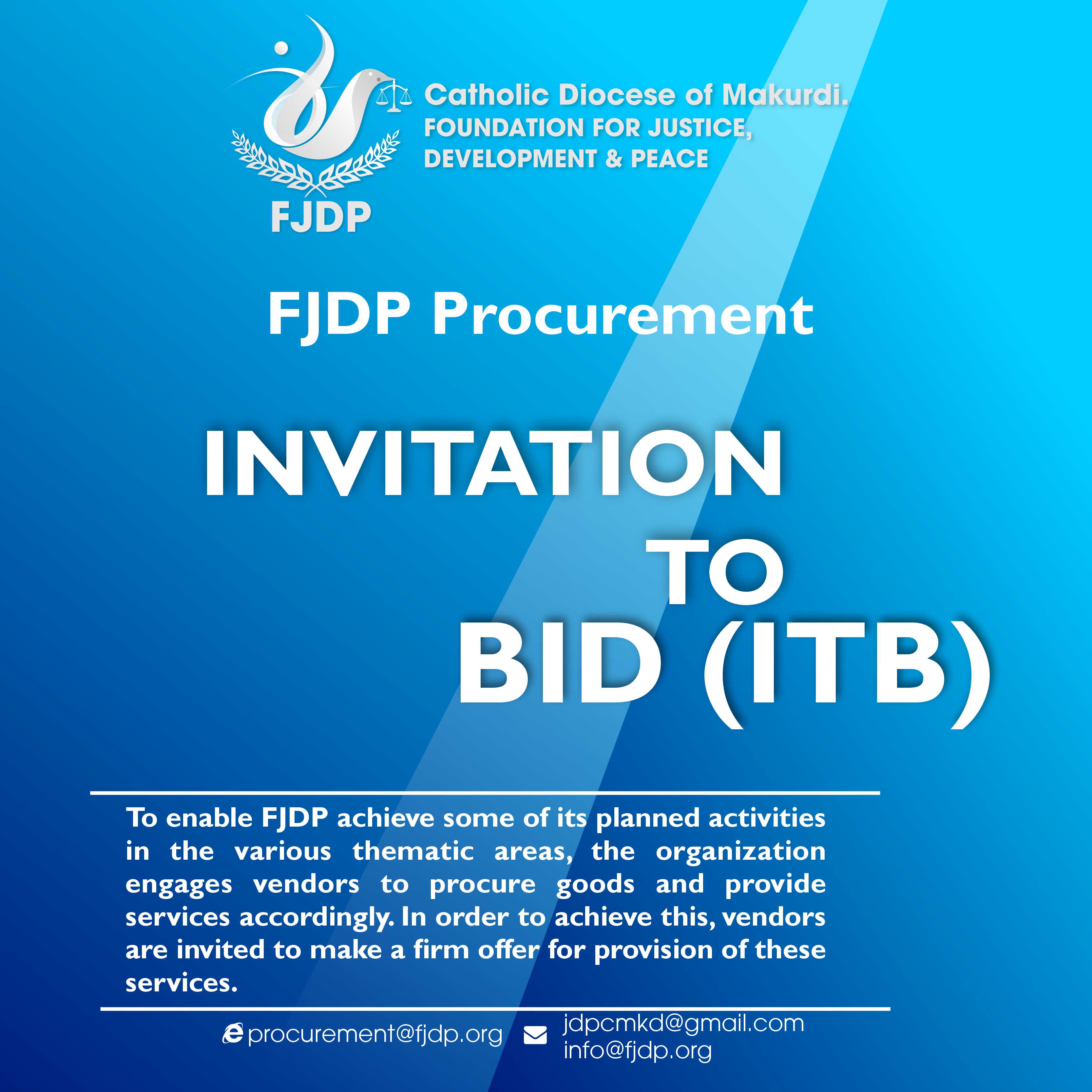 To enable FJDP achieve some of its planned activities in the various thematic areas, the organization engages vendors to procure goods and provide services accordingly. In order to achieve this, vendors are invited to make a firm offer for provision of these services.